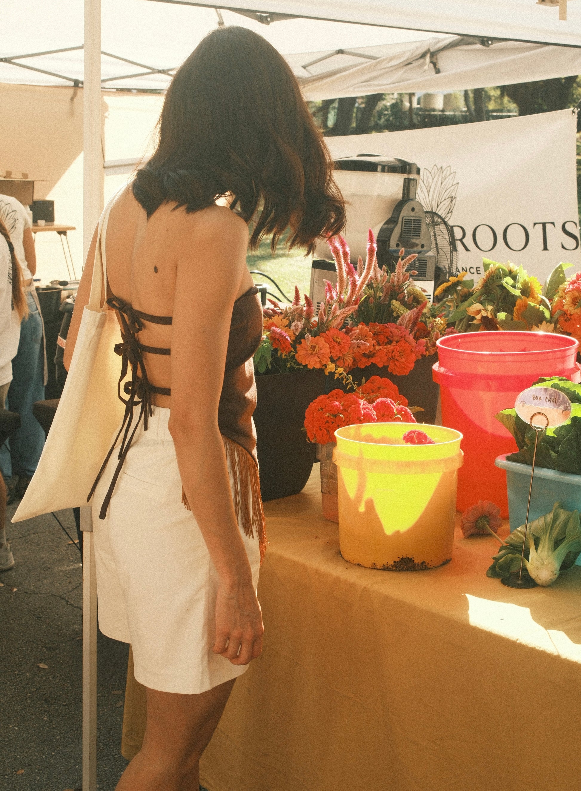 Fluid & Free. The Joujou moves like beachy landscapes. Its wavy neckline mirrors the flow of the ocean while the fringes mimic the sway of palm trees, adding motion to the form. The Joujou top is designed with our signature backless silhouette and adjustable straps for the perfect fit.